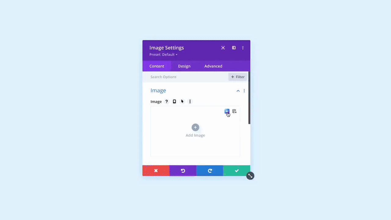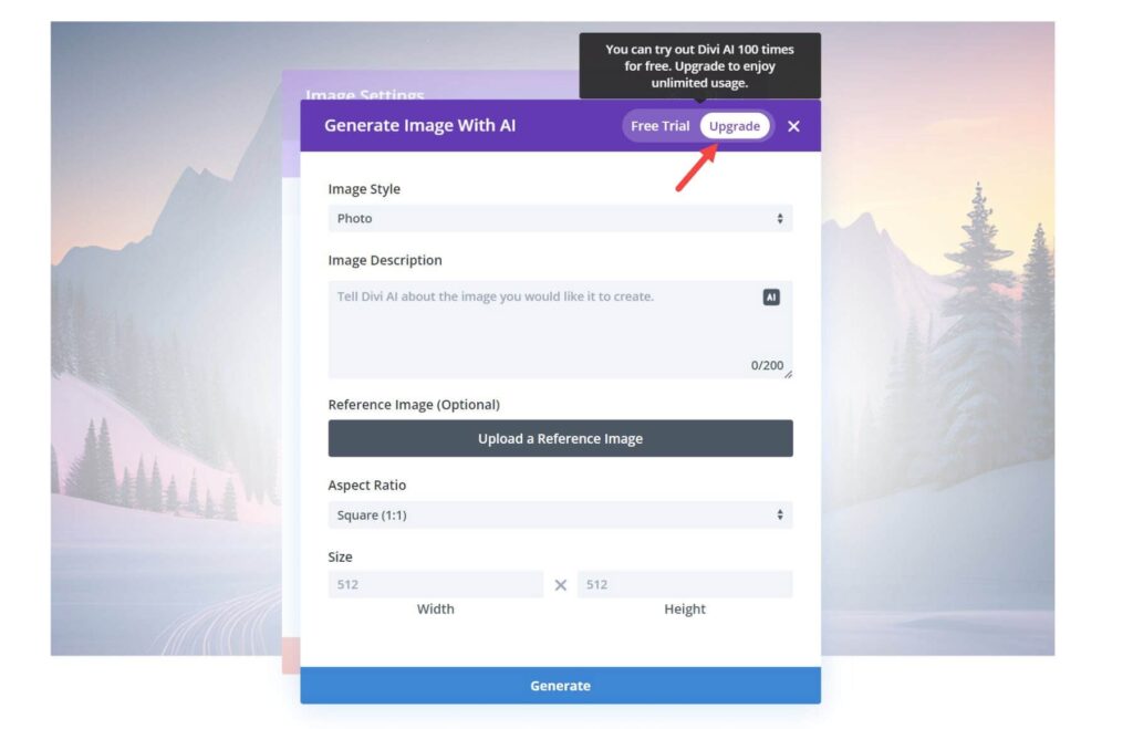 • Editor de imágenes con IA: Esta herramienta permite a los usuarios modificar imágenes directamente dentro del constructor Divi. Puedes generar nuevas imágenes, reinventar las existentes y alterar elementos específicos manteniendo la composición general.