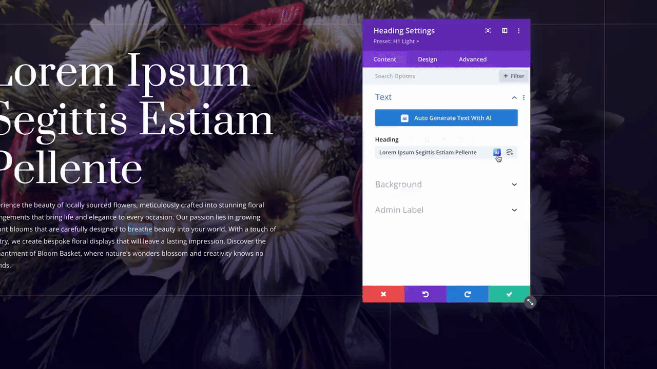 Divi AI también está disponible para elementos estructurales (secciones, filas y columnas), los cuales te permiten añadir imágenes de fondo.