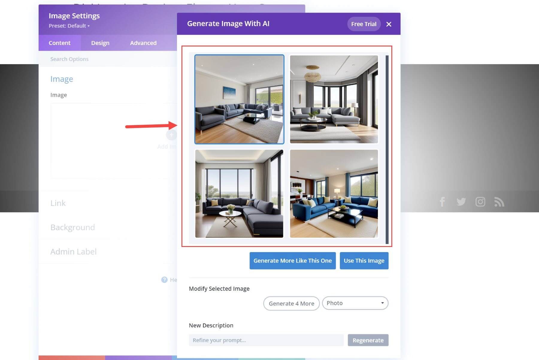 Si usas automáticamente un módulo de imagen para generar una imagen con Divi AI, obtenemos resultados de fotos de diseño interior consistentes con la información de mi sitio web.