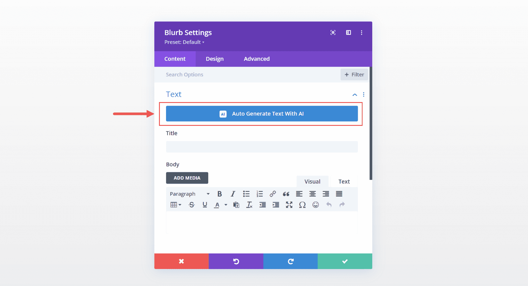 • Generación de texto: Divi AI puede generar contenido escrito de alta calidad adaptado a las necesidades específicas de tu sitio web. Esto incluye la creación de publicaciones de blog atractivas, descripciones de productos y textos para páginas de aterrizaje.