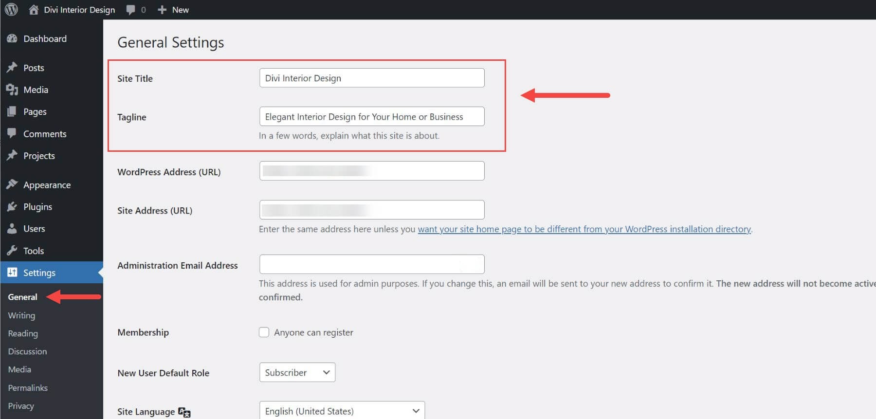 Supongamos que tienes un sitio web titulado Divi Interior Design con el lema Elegant Interior Design for Your Home or Business.