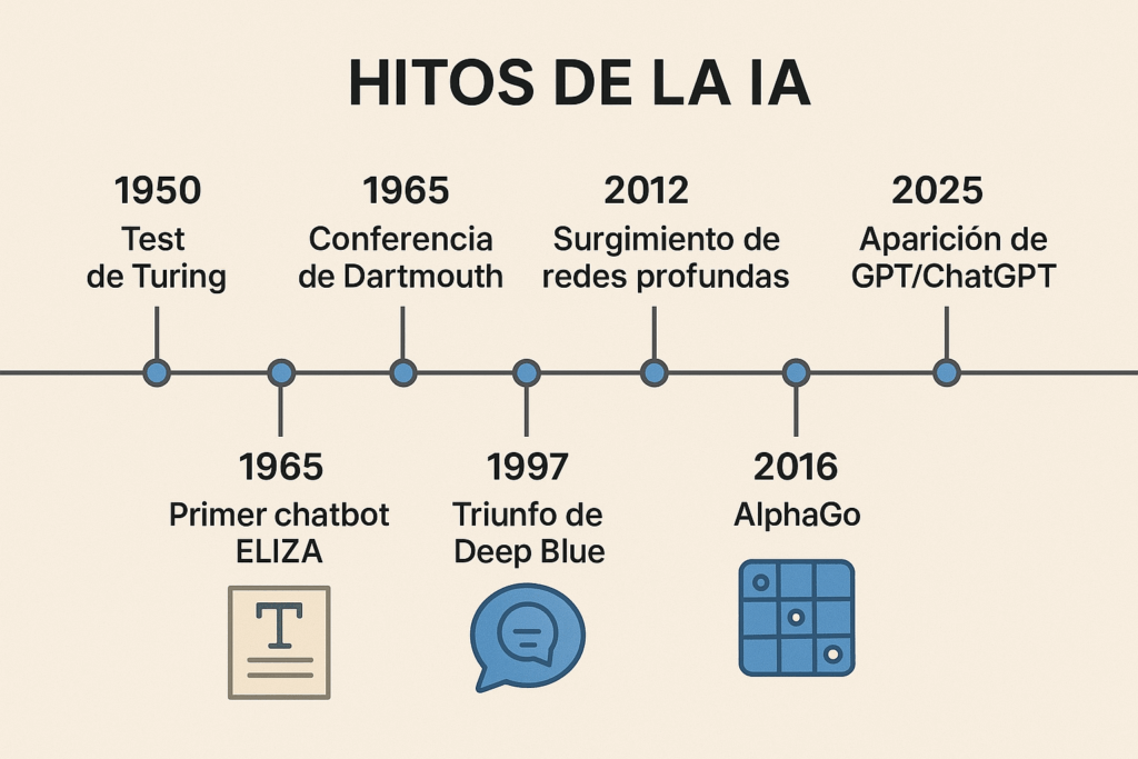 La inteligencia artificial (IA) no es un invento reciente; sus conceptos fundamentales se remontan a mediados del siglo XX. A lo largo de las décadas, la IA ha pasado de ser una idea teórica a convertirse en una realidad cotidiana. En esta lección exploraremos la evolución histórica de la IA, desde sus primeros pasos hasta la actualidad, destacando los hitos clave que han marcado su desarrollo.