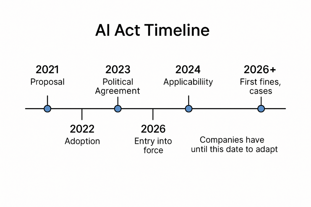 La AI Act, tras su aprobación formal en 2024, entró en vigor en agosto de 2024. Sin embargo, la mayoría de sus disposiciones no serán exigibles inmediatamente; se dio un período de transición para que las empresas y Estados miembros se preparen. Se prevé que a partir de 2026 las reglas serán ya de cumplimiento obligatorio (aproximadamente dos años tras la entrada en vigor, que es el tiempo típico de adaptación en la UE). Algunas obligaciones, como prohibiciones de ciertos usos especialmente graves, pueden aplicarse algo antes, pero en general las empresas tienen ese margen para adecuar sus sistemas. Esto significa que, para 2025-2026, cualquier emprendedor que quiera ofrecer un sistema de IA en Europa debe ya estar revisando cómo encajará en estas categorías y qué necesita hacer para entonces.